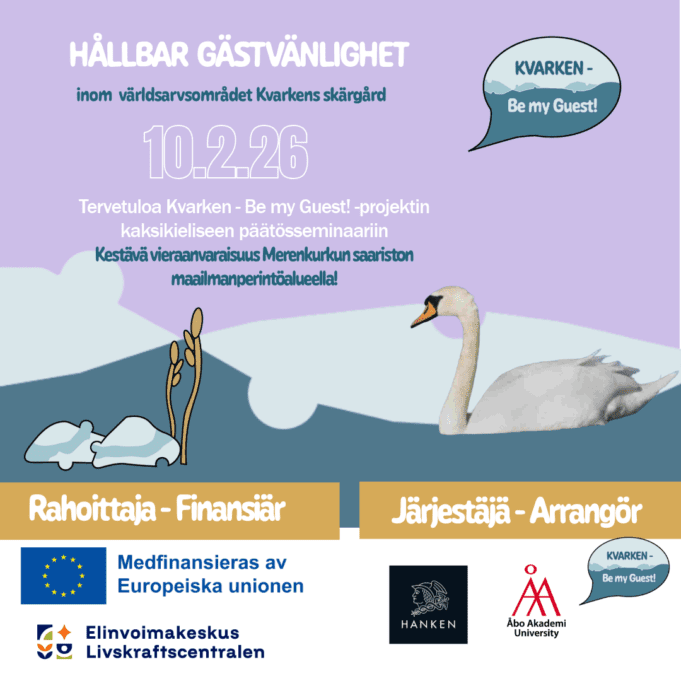 Hanken ja Åbo Akademi tekevät yhteistyötä Kvarken – Be my guest! -projektissa, jonka tavoitteena on kehittää Merenkurkun saariston matkailusta entistä kestävämpää, saavutettavampaa ja vieraanvaraisempaa. Projekti on saanut EU:n maaseuturahoitusta ELY-keskukselta, jonka tehtäviä hoitaa nykyisin Elinvoimakeskus. Lisätietoja projektista: annika.pollari@hanken.fi